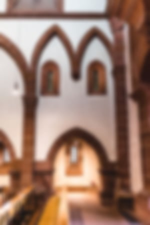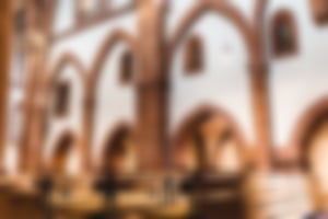 Wenn du nach oben siehst, kannst du innerhalb der Kirche einen Gang mit Fenstern erkennen.